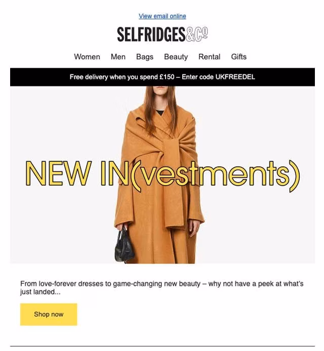 For example, this email from Selfridges has the CTA ‘Shop now’ that creates a sense of urgency, and is also repeated two more times throughout the email.