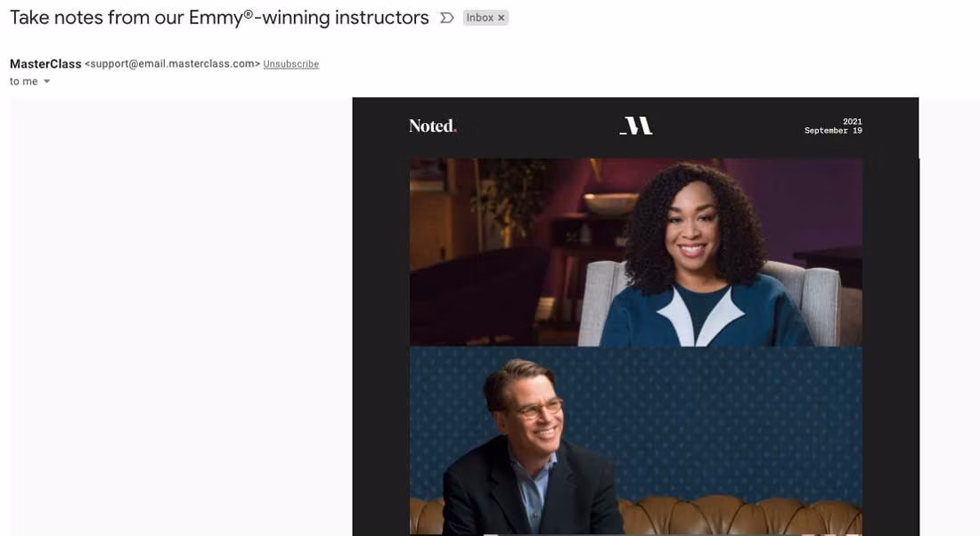 For example, look at this email from Masterclass, with the subject line: Take notes from our Emmy-winning instructors.